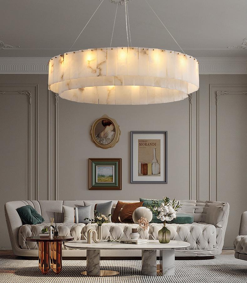Thân đèn được gia công từ hợp kim cao cấp không gỉ, bền bỉ với thời gian, kết hợp hệ dây treo chắc chắn giúp giữ vững dáng vẻ thanh lịch. Ánh sáng ấm áp lan tỏa qua các phiến đá onyx trắng tự nhiên, tạo nên cảm giác thư thái và quý phái, đặc biệt phù hợp với không gian phòng khách, sảnh lớn, biệt thự, hoặc khách sạn cao cấp.