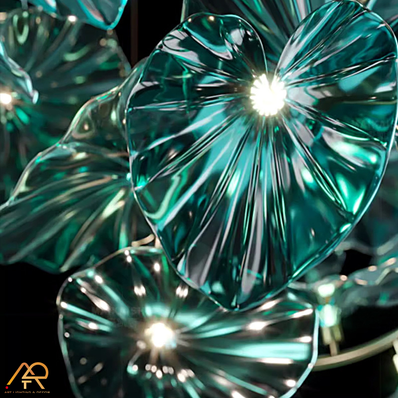 Cấu trúc lõi của đèn chùm bao gồm nhiều thành phần thủy tinh được chế tác khéo léo để mô phỏng theo lá sen ở nhiều kích thước và hướng khác nhau. Mỗi "lá sen" được làm từ thủy tinh trong suốt màu xanh nước biển chất lượng cao, có khả năng bắt và khúc xạ ánh sáng tuyệt đẹp. Các mảnh thủy tinh được định hình tỉ mỉ để mô phỏng các đường cong và gợn sóng tự nhiên của lá súng thật, hoàn chỉnh với các đường gân tinh tế và các cạnh cong nhẹ nhàng.