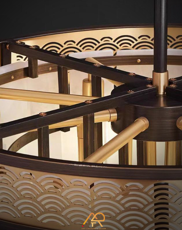 Đường nét khung đèn được cắt CNC và chạm khắc hoa văn tỉ mỉ, tôn lên sự tinh tế và cao cấp, không bao giờ lỗi mốt.