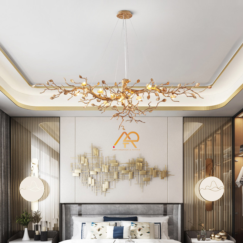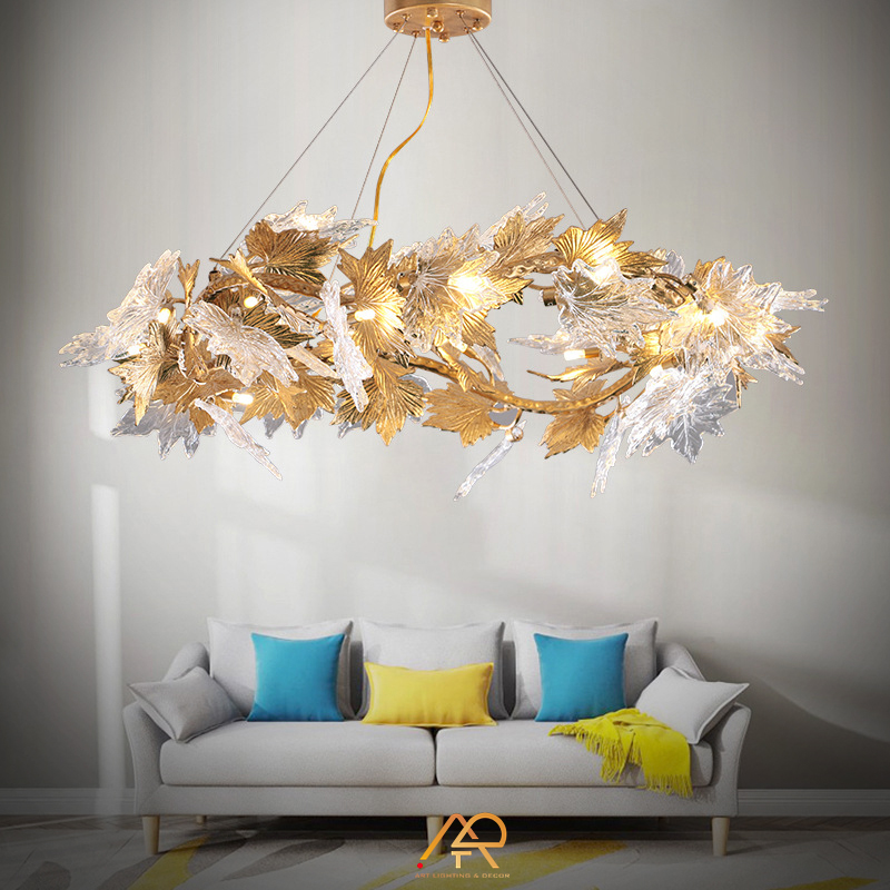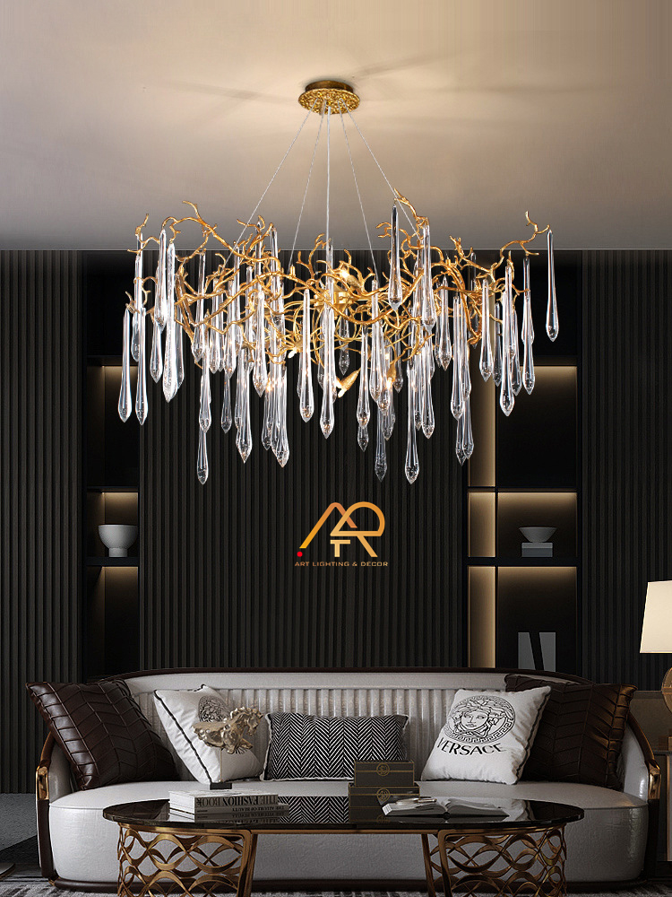 Khung đèn được làm từ đồng, đồng thau được gia công với độ chính xác cao để tạo nên kết cấu bền bỉ nhưng thanh thoát. Pha lê cao cấp được thổi và chế tác thủ công, tạo ra hiệu ứng ánh sáng rực rỡ nhưng không chói mắt.