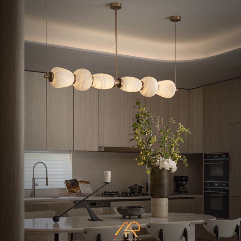 Phần chao đèn được chế tác từ đá cẩm thạch, với hiệu ứng ánh sáng xuyên đá tạo ra một bầu không khí ấm áp, thư giãn, lý tưởng cho không gian bàn ăn hoặc đảo bếp hiện đại.